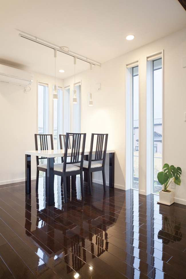 ダークブラウンの木をスタイリッシュに活かした、おしゃれなおうちです。美しいリビングからは、お施主様のこだわりのライフスタイルが伝わってくるようです。インテリアが美しさを更に添えています。